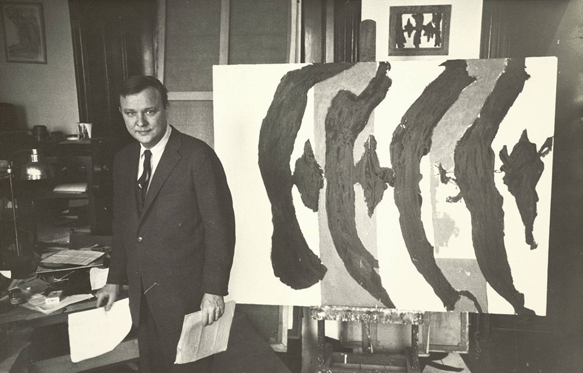 Robert Motherwell in his E. 94th St. studio with an early state of Wall Painting No. III